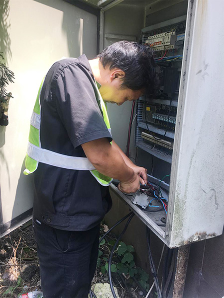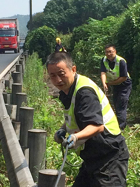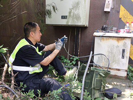 圖為修復(fù)后的隧道口路燈 對(duì)于修復(fù)被盜電纜,一般最直接的做法是重新再拉一根新電纜至配電箱,利用箱內(nèi)現(xiàn)成的控制開關(guān)和交流接觸器等元器件,完成整個(gè)電纜連接工作,但中心隊(duì)員考慮到此種方法不僅工作量大,修復(fù)成本高,而且存在再次被盜的可能性,如果用鋁線代替,電力傳輸又要大打折扣。于是,他們另辟蹊徑,計(jì)劃從剩余配電箱至路燈還有200余米未被盜取的電纜中截取一段,直接和洞口情報(bào)板電纜相接,這樣既能節(jié)省人力、物力,又能以最快速度恢復(fù)路燈正常工作。 當(dāng)天一早,中心隊(duì)員帶上相應(yīng)的工具和設(shè)備直奔現(xiàn)場(chǎng),在確認(rèn)電纜位置及走向后,便著手抽離洞內(nèi)電纜??紤]到洞口到配電箱電纜至少有100余米,電纜溝下面又鋪有其他眾多電纜以及之前掉落的垃圾,直接從洞口抽離根本無(wú)法動(dòng)彈。于是,中心4名隊(duì)員便每隔10米左右用撬棍撬開上面水泥蓋板,整個(gè)人跳進(jìn)電纜溝內(nèi),彎著腰一段一段抽離。抽到最后一個(gè)溝時(shí),4人頂著烈日,齊力把重達(dá)近百斤電纜抽離整個(gè)電纜溝并放置在護(hù)欄內(nèi)側(cè)草地上,隨后再?gòu)某槌龅倪@段電纜中剪取適當(dāng)長(zhǎng)度,重新鋪設(shè)后與寧向出洞口的情報(bào)板電纜相接。 臨近中午,戶外溫度不斷升高,中心隊(duì)員早已濕透衣背,為趕在一天中最熱的時(shí)間點(diǎn)前完成任務(wù),4名隊(duì)員臨近解決午餐又迅速奔赴現(xiàn)場(chǎng),拆除原配電箱內(nèi)的舊器件,將其用回到新的供電線路中,而多余的器件則捆綁打包帶回中心以留備用,節(jié)省公司后期維養(yǎng)成本。 下午1:40,經(jīng)過(guò)通電測(cè)試,9盞路燈全部恢復(fù)正常工作。集團(tuán)總工程師江輝在工程部微信群里肯定了中心工作,并提醒一線人員切記做好防暑降溫工作,注意自身身體狀況。