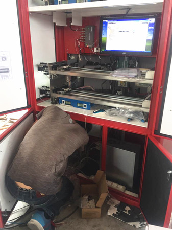 圖為工作人員正在對發(fā)卡機內部進行接線