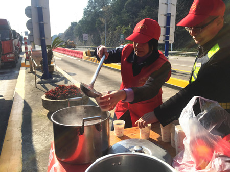 圖為工作人員在備熱飲品 當天是入冬以來最冷的一天,收費崗亭周圍氣溫達到零下4度。該所員工身穿耀眼的“紅馬甲”,面帶微笑,在車道安全島內(nèi)搭起臨時“便民服務臺”,頂著嚴寒為過往司乘人員遞上一杯杯滾燙的姜茶與紅豆湯,并提醒司機朋友天冷注意保暖。 “姜茶暖我身、服務心貼心?。 币晃凰緳C師傅接過姜茶不由地詩意起來。 “你們服務態(tài)度真好,有禮貌,充滿熱情,這么冷的天,能有一杯熱水是多么幸福的事情??!”另一位司機朋友一臉笑意地稱贊道。 他們的友好回應讓員工們忘了寒冷,也給了大家提供更貼心服務的動力。