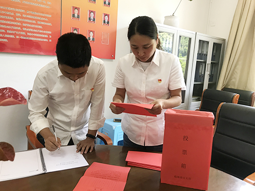 圖為投票現(xiàn)場 會議通過舉手表決方式一致通過了選舉辦法和監(jiān)票人、計票人名單。本次選舉大會應(yīng)到正式黨員11名,實(shí)到10名。經(jīng)過計票、監(jiān)票等程序,以差額無記名方式推選孫明偉、周戰(zhàn)、陳瑩三名同志為新一屆支部委員會委員。在隨后召開的支委會第一次會議上,選舉孫明偉任支部書記,周戰(zhàn)任紀(jì)律委員,陳瑩任組織宣傳委員。