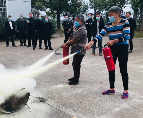 圖為使用滅火器演練 隨后,該所開展滅火器使用模擬演練。在演練中,大家利用平時更換下來的舊滅火器,依次輪流進行操作,更有一些員工主動熱心幫助保潔阿姨們講解如何正確使用滅火器,以身示范正確操作方式及每一個分解動作要領(lǐng)。