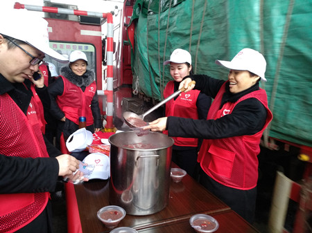 圖為志愿者給過(guò)往司機(jī)送上臘八粥