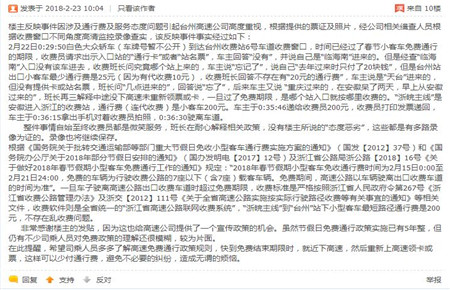 集團(tuán)對(duì)此事件高度重視,當(dāng)即調(diào)取當(dāng)時(shí)多路監(jiān)控錄像,還原了事件真相。2月22日凌晨0:29:50,投訴人駕駛小轎車(chē)進(jìn)入臺(tái)州6號(hào)車(chē)道時(shí)間已經(jīng)過(guò)了春節(jié)小客車(chē)免費(fèi)通行的期限,收費(fèi)員黃智超請(qǐng)求出示入口站的通行卡或者紙質(zhì)繳費(fèi)憑證,車(chē)主回答無(wú)卡無(wú)票,聲稱(chēng)自己臨海南上進(jìn)入高速。經(jīng)查證,臨海南沒(méi)有該車(chē)的入口信息。收費(fèi)班長(zhǎng)再次詢(xún)問(wèn)時(shí),車(chē)主說(shuō)“忘記了”,說(shuō)自己“去年過(guò)來(lái)時(shí)只付了20塊錢(qián)”,但是臺(tái)州站出口小客車(chē)最少通行費(fèi)是25元(因?yàn)橛写召M(fèi)10元),收費(fèi)班長(zhǎng)回答不存在有“20元的通行費(fèi)”,司機(jī)忽而改口說(shuō)是天臺(tái)進(jìn)的,忽而想了一下又說(shuō)重慶過(guò)來(lái)的,在安徽呆了兩天,當(dāng)天早上從安徽上的高速。班長(zhǎng)再三解釋中途沒(méi)下高速未重新領(lǐng)票或卡,一旦過(guò)了免費(fèi)期限,是哪個(gè)站入口就按哪里收費(fèi)的。“浙皖主線(xiàn)”是安徽進(jìn)入浙江的收費(fèi)站,通行費(fèi)(連代收費(fèi))是小客車(chē)200元。車(chē)主于0:35:46遞給收費(fèi)員200元,收費(fèi)員打印發(fā)票遞回,車(chē)主于0:36:15拿出手機(jī)對(duì)著收費(fèi)員拍照,0:36:30駛離車(chē)道。