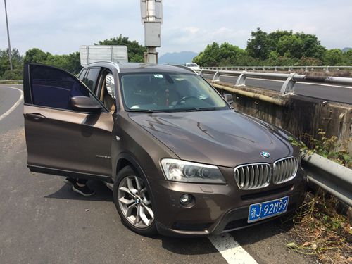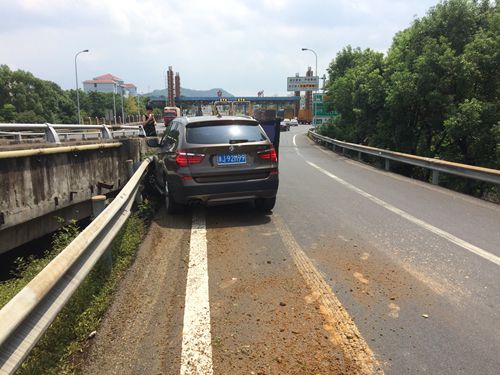 8月13日上午10:30分左右,臺(tái)州收費(fèi)所出口寧向匝道口有一輛黑色寶馬X3斜靠在護(hù)欄旁,其車(chē)頭左側(cè)因碰撞護(hù)欄而嚴(yán)重凹陷,左前輪胎報(bào)廢。 當(dāng)時(shí),該所出口五號(hào)車(chē)道的欄桿發(fā)生故障,需要暫時(shí)關(guān)閉進(jìn)行維修。班長(zhǎng)張海勇在內(nèi)廣場(chǎng)引導(dǎo)車(chē)輛時(shí)發(fā)現(xiàn)此起事故,走近細(xì)看,由于碰撞激烈該車(chē)前檔玻璃破裂,前排安全氣囊彈出,而車(chē)旁的兩個(gè)人驚恐未定不知所措。此時(shí)匝道口車(chē)流不斷,因駕駛員遲遲找不到三角牌,為避免二次事故的發(fā)生,張海勇在車(chē)后方指揮交通,并提醒車(chē)旁人員站在護(hù)欄外安全位置,同時(shí)報(bào)告指揮中心事故車(chē)的位置和損傷情況。
