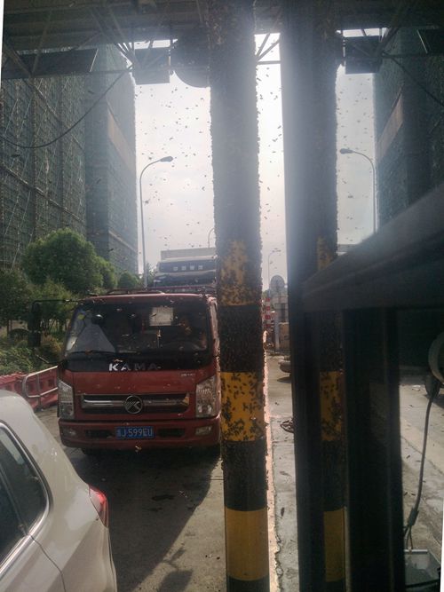 圖為蜜蜂集聚在收費站 原來這輛綠通車運輸蜂箱,由于蜂箱沒有關(guān)閉嚴(yán)實,在車通過車道檢查稍作停留時,大量的蜜蜂乘機逃出,圍攻收費崗?fù)?,天空瞬間一片密密麻麻。它們有的停留在車道的防撞柱上,有的在收費窗口附近盤旋,遲遲不肯離開,嚇得過收費站等待繳費的司機不敢開車窗繳費。