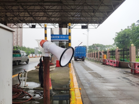圖為入口處放置的語音警報小喇叭 在嚴(yán)把入口關(guān)中,該所要求入口必須有人員在崗,履行“一崗雙職”的重任,時刻關(guān)注入口情況,及時發(fā)現(xiàn)并勸阻違規(guī)車輛和人員的進(jìn)入。此外,入口顯眼處懸掛“請珍愛生命,禁止行人和非機(jī)動車上高速”的警示標(biāo)語。入口處增添放置的管控小助手---語音警報器,循環(huán)播放普通話和方言警示標(biāo)語:“行人、自行車、摩托車禁止上高速公路”。入口安全島頭和邊溝處放置水碼,防止行人、摩托車、電動車和自行車從邊溝處和超寬車道進(jìn)入高速。而由維養(yǎng)中心人員在入口高處安裝的攝像裝置,只要行人、自行車等非機(jī)動車輛出現(xiàn)在攝像范圍內(nèi),就會立刻傳來“警戒區(qū)域,請盡快離開”的持續(xù)性警報聲。在人員的管控和設(shè)備的警示下,收費所入口安全不斷地提升。