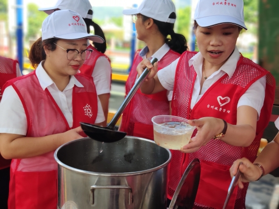 圖為志愿者合影 上午9點,志愿者們身著統(tǒng)一紅馬甲,在崗亭的安全島上設(shè)立服務臺,抬出食堂提前制作好的青草糊、綠豆湯等清涼飲品。你來分杯我來送,大家不亦樂乎開始了送清涼活動。