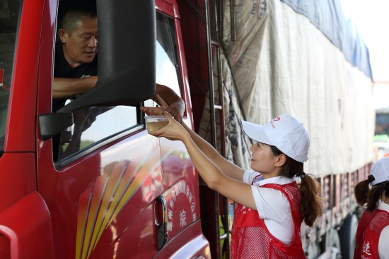圖為志愿者給司乘遞上飲品 在送清涼的同時,志愿者們還溫馨提醒司機朋友們不要疲勞駕駛,高溫天氣中注意行車安全,并為不熟悉路況的司乘指引路線。此外,工作人員還在“便民小藥箱”中補充了防暑等應急藥品,以應對高溫中暑等突發(fā)狀況。 一杯杯清涼的飲品,幾句簡短而溫馨的交流,拉進了志愿者們與司乘人員之間的距離,司乘人員的好評將整個活動現(xiàn)場推向高潮。 該所共計送出200多份清涼飲品,受到廣大司乘人員的一致好評。大家用實際行動傳遞文明,延伸了服務的同時,更展示出臺州高速人的良好形象。 楊雅芬