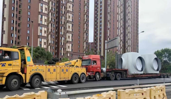 圖為被施救車拖出的超限車 接到電話的第一時間,當(dāng)班班長上報所領(lǐng)導(dǎo),并丈量回復(fù)指揮中心出口超寬車道寬為4米,進(jìn)口超寬車道地面寬為4.8米。經(jīng)協(xié)調(diào),超限車輛從臺州收費所入口車道下高速。副所長和班長隨即拆除內(nèi)廣場的中央隔離帶,以便車輛可以通行。11:50分,交警攔住寧向出囗車,入口封閉。施救車拖著該車緩緩從入口車道開出。 經(jīng)詢問得知,該車辦理了超限運輸車輛通行證,運載大型輪轂從樂清上高速去內(nèi)蒙,結(jié)果行駛至臺州時,車子出了故障。該車車重84噸,原本需要繳納通行費695元,大件運輸優(yōu)惠后僅需繳納395元。雖然車子壞了,但駕駛員依然向工作人員表示感謝,并感言合法裝載的好處,不然還要面臨處罰。入口封閉大概二十分鐘后,車道恢復(fù)通行。