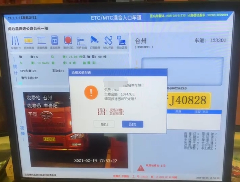 自取消省界收費(fèi)站全國(guó)高速公路聯(lián)網(wǎng)后,跨省追繳通行費(fèi)一直是個(gè)大難題,不少司機(jī)的省外通行費(fèi)因無(wú)法追繳,造成通行費(fèi)不斷流失。交通部為了適應(yīng)“全國(guó)一張網(wǎng)”稽核業(yè)務(wù)工作需要,確保各收費(fèi)站現(xiàn)場(chǎng)有序處理追繳名單車輛,避免造成社會(huì)輿情和人身財(cái)產(chǎn)安全事件,研發(fā)了全國(guó)稽核通行費(fèi)補(bǔ)費(fèi)系統(tǒng)。 2月19日晚17點(diǎn)50分左右,臺(tái)州收費(fèi)所進(jìn)口迎來(lái)一輛車牌為浙J開(kāi)頭的六類貨車,車道屏幕顯示為“浙J XXXXXX追繳名單車輛,欠費(fèi)4次,欠費(fèi)金額1074.9元,請(qǐng)同步補(bǔ)繳APP處理?!碑?dāng)班收費(fèi)員見(jiàn)此詢問(wèn)駕駛員是否欠費(fèi),并喊來(lái)當(dāng)班班長(zhǎng)張錚過(guò)來(lái)處理。