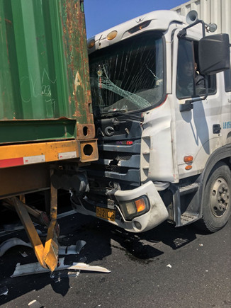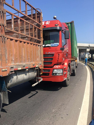 上圖為事故車輛 當(dāng)天中午,在副站崗?fù)づ哉镜墓ぷ魅藛T發(fā)現(xiàn)該所前方出口不遠處有貨車停在那里不動,以致后面車輛無法通行。工作人員隨即跑到前方查看情況,原來是三輛貨車發(fā)生追尾,其中有一輛車車頭被撞得凹陷,擋風(fēng)玻璃也被撞碎,在了解事故現(xiàn)場無人員受傷后,工作人員馬上向監(jiān)控中心匯報情況。由于事故車輛較大面積滯留,導(dǎo)致后方車子堵到主線上,一些不明情況的駕駛員在車里使勁按喇叭催促,現(xiàn)場充滿焦躁情緒。 如何盡快疏通道路?正在食堂吃飯的一班班長潘慶耀放下碗筷跑到事故現(xiàn)場,同工作人員叫前面受損較少的事故車輛先把車子開出收費站,再讓第三輛受損嚴重的車子試著發(fā)動車子開出去,所幸三輛車子都能開離車道。在將地上的破損碎片清理到車道兩旁后,工作人員繼續(xù)指揮車輛向前行駛,收費內(nèi)廣場在較短時間內(nèi)恢復(fù)了正常通行。 沈芬芳