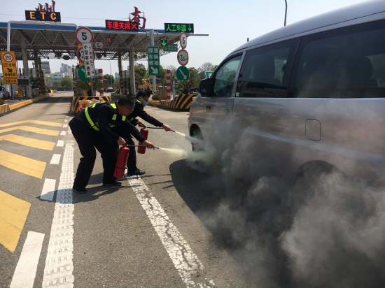 圖為交通事故應(yīng)急演練 在收費廣場交通事故應(yīng)急預(yù)案演練中,該所模擬了汽車在收費車道起火的交通事故。事故發(fā)生后,當(dāng)班班長第一時間啟動預(yù)案,將險情報告監(jiān)控員,并立即關(guān)閉事故車道,組織人員對起火點進(jìn)行前期壓制,同時指揮人員擺放標(biāo)志,引導(dǎo)后續(xù)車輛,并快速放行。接到險情報告的所長、辦公室人員迅速趕到現(xiàn)場參與救援:女同志協(xié)助班組開足車道;部分男同志負(fù)責(zé)出入口車輛的疏導(dǎo)指揮工作;其余人員負(fù)責(zé)對火災(zāi)進(jìn)行撲滅……大家各司其職,快速處理險情。