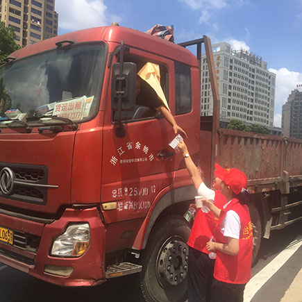 圖為骨干人員為過(guò)往司機(jī)遞上降溫降暑用品