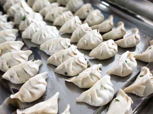圖為包餃子現(xiàn)場 本次比賽共有五個小組,21人參加,比賽時間為1個小時,各班各自不限男女,由各參賽隊自行選擇餃子餡和調(diào)味,由評委根據(jù)比賽時間內(nèi)的餃子數(shù)量、外觀及口感進行打分評定。 隨著主裁判史靜宜一聲令下,各組選手拿出領(lǐng)到的餃子皮和餃子餡,開始麻利地忙活起來。比賽過程中,笑聲、喝彩聲不斷,組員之間分工協(xié)作,一排排獨具個性的餃子很快就擺滿了一個個盤子。桌子上的餃子,雖然有大有小,有扁有圓,但每個人臉上都洋溢笑容。