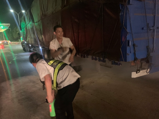 圖為收費(fèi)員協(xié)助司機(jī)滅火 當(dāng)時(shí),正值收費(fèi)員林王鍵負(fù)責(zé)高速入口的安全工作。他在巡查自助發(fā)卡機(jī)時(shí)發(fā)現(xiàn)入口處一輛貨車突然起火,隨之冒起了大片煙霧,并伴隨著刺鼻的氣味。林王鍵見狀立馬拎起身邊的滅火器就向貨車跑去,并且向班長報(bào)告。在工作人員和司機(jī)齊心協(xié)力撲救下,大火十幾分鐘就被撲滅了。經(jīng)過檢查,起火的原因是因?yàn)樨涇噭x車突然抱死,摩擦起火。所幸大火并未造人人員傷亡和財(cái)產(chǎn)損失。 大火撲滅后,司機(jī)連連道謝,如果不是大家?guī)兔皶r(shí)撲滅,后果不堪設(shè)想,他為工作人員這種奮不顧身的精神點(diǎn)贊。 在此,提醒各位司機(jī),車輛上一定要配備滅火器等急救設(shè)備,特別在炎熱的夏天,是車輛起火的多發(fā)時(shí)期,配備滅火器可以有效控制火災(zāi),減少損失。 楊相暖