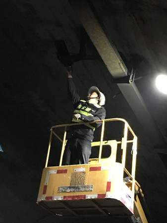 圖為黃土嶺執(zhí)勤隊(duì)員在清潔燈具和攝像鏡頭