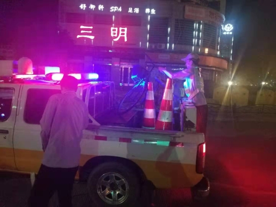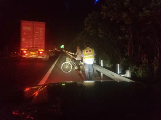 圖為執(zhí)勤隊(duì)發(fā)現(xiàn)騎車人 9月24日21:09分,大溪嶺隧道所中控室發(fā)出通知。執(zhí)勤隊(duì)員接中控指令,迅速出警。晚上九點(diǎn),在高速公路上找人,需得打上12分的精神,巡邏車放慢車速,坐于后座的隊(duì)員們緊盯著車道兩旁,終于在21:14分,距離寧向隧道出口一公里處發(fā)現(xiàn)該騎車男子,隊(duì)員們立即上前將其攔住。眼前的一幕令執(zhí)勤隊(duì)員嚇出一身冷汗,該男子左手殘疾,單手騎車,晚上視線模糊,且高速公路上車多,速度快,司機(jī)很難發(fā)現(xiàn)有行人,如發(fā)現(xiàn)躥出來的行人而采取緊急制動(dòng),會(huì)造成多起追尾事故,現(xiàn)場(chǎng)情況非常危險(xiǎn)!隊(duì)員們合力將自行車抬上車。