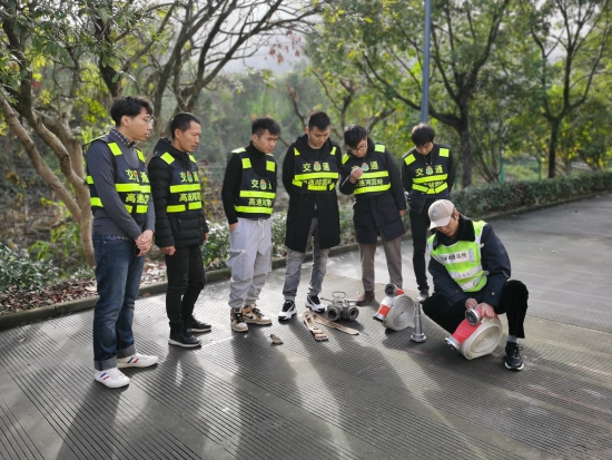 圖為陶文輝在教樂清公司員工如何進行水帶操作 本次培訓(xùn)對隧道預(yù)警流程、二帶連接及執(zhí)勤隊在平時巡邏、預(yù)警、處理事故中如何確保自身安全等進行重點講解。執(zhí)勤隊長帶領(lǐng)隊員們在管理所操場進行模擬主線卡口、事故拋錨車預(yù)警封道操作,樂清公司員工觀摩之后也進行實際操作,孫鵬詳細講解擺放隔離錐應(yīng)注意事項,每一隔離錐的間隔位置、巡邏車后方擺放的安全距離,事故處理之后,收隔離錐應(yīng)注意的安全動作。陶文輝為樂清公司員工演示“二帶連接”,并對水帶的甩、接、收每一動作盡可能詳細仔細地進行解說示范。