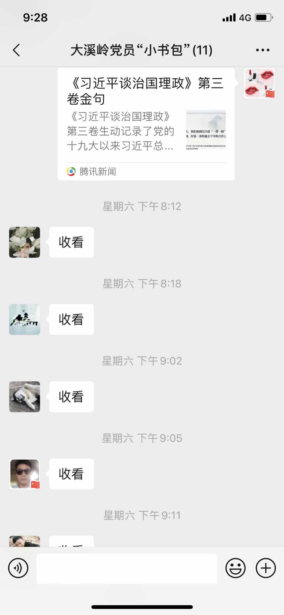 黨員“小書包”的建立,進(jìn)一步拓展和暢通了聯(lián)系黨員的信息渠道,可以24小時(shí)在線聯(lián)系黨員、征求意見,能在線進(jìn)行實(shí)時(shí)回復(fù)和互動(dòng),同時(shí)可以通過微信群及時(shí)發(fā)布上級(jí)文件精神、習(xí)近平總書記重要講話內(nèi)容、學(xué)習(xí)教育心得、會(huì)議通知等等,進(jìn)一步提高學(xué)習(xí)教育效能。 黨員“小書包”的建立,讓黨員們的學(xué)習(xí)內(nèi)容不受書本限制,學(xué)習(xí)教育不受地域、場(chǎng)所的限制,在繁忙的工作學(xué)習(xí)之余,大家可以在微信群中了解當(dāng)前時(shí)下最新的學(xué)習(xí)內(nèi)容、信息和動(dòng)態(tài),相互學(xué)習(xí),交流體會(huì),無形提升自己的政治素養(yǎng)。 黨員“小書包”的建立,實(shí)現(xiàn)了黨組織和黨員之間“親密”、“即時(shí)”、“微距”的接觸,加強(qiáng)了黨員同黨組織之間的信息互動(dòng)。通過“小書包”的建設(shè),大溪嶺學(xué)習(xí)教育時(shí)刻保持鮮活的生命活力和時(shí)代氣息,形成了“輕松自主學(xué)習(xí)、實(shí)時(shí)互動(dòng)交流”的良好學(xué)習(xí)氛圍,提供了更好的動(dòng)力。