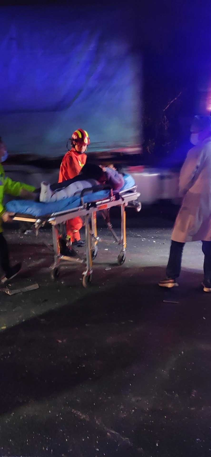 21:50巡邏車和消防車同時到達現(xiàn)場,隊員陳幸飛快的跑下來,以百米沖刺的速度做好巡邏車的安全措施和預警工作,有3人受傷,事故車頭已嚴重變形,一名女性腰部受傷坐在地上,語速正常,思維清晰。還有二名人員被卡在駕駛室,消防隊員正在查看現(xiàn)場準備施救,受傷人員哭爹喊娘嚎聲不斷,由于救護車還沒達到現(xiàn)場,陳幸在事故車后方硬路肩上維護秩序,防止車輛占道,并同時迎接救護車,湯寧光則在維護現(xiàn)場秩序,阻止其他司機圍觀影響救援。 22:00第一輛救護車到達。醫(yī)護人員準備擔架,另一名醫(yī)生去詢問坐在地上的受傷人員,由于車頭嚴重變形,司機與鄰座的人都被卡在駕駛室,經(jīng)過消防員的救援,受傷最嚴重的司機首先被救了下來,在被救下的那刻暈了過去,醫(yī)護人員立該把傷員抬上救護車,緊接著消防員救下第二位被卡傷員,第二輛救護車帶著傷員離開,最后一輛救護車卻遲遲沒到,經(jīng)聯(lián)系監(jiān)控中心后得知救護車已上高速,但因后方車輛太多,救護車和拖車都被堵了,經(jīng)和臺州高速交警協(xié)商后,最后清理一個車道讓救護車和拖車先開上來,巡邏車去事故車后方預警,22:30救護車帶走最后一名傷員,事故車被拖走,路面恢復正常通車。