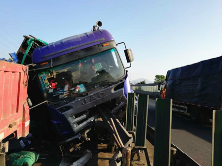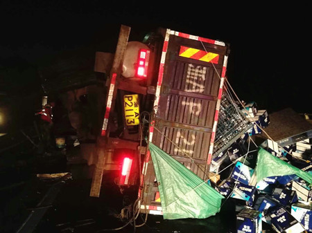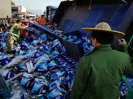 8月25日凌晨4點,甬臺溫高速溫向1648+7路段,一輛運啤酒的大貨車因司機疲勞駕駛,導致車輛撞上中央護欄而側(cè)翻,啤酒灑滿一地,后方兩輛貨車避讓不及造成多車事故。