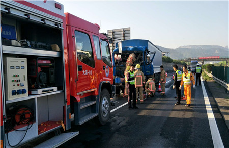 4月19日上午6點(diǎn)10分,寧向大溪出口正在進(jìn)行分流,所有車輛正緩慢前行中,一輛贛F38***牌照的藍(lán)色大貨車顯然還沒有適應(yīng)這分流的節(jié)奏,“砰”地一聲猛然撞上了前面的大貨車。 兩個(gè)“大家伙”碰撞的威力非同小可,直接的后果就是后車的車頭變形,損傷極大,貨車駕駛員被卡在車頭里出不來。 時(shí)間就是生命,施救中心迅速出動,配合交警、消防部門在現(xiàn)場進(jìn)行預(yù)警,并協(xié)助進(jìn)行事故處理。
