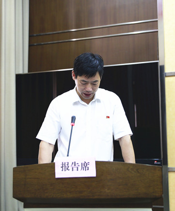 圖為公司副總經(jīng)理陳保衛(wèi)宣讀《關(guān)于轉(zhuǎn)讓臺州高速泰和房產(chǎn)公司股權(quán)的議案》