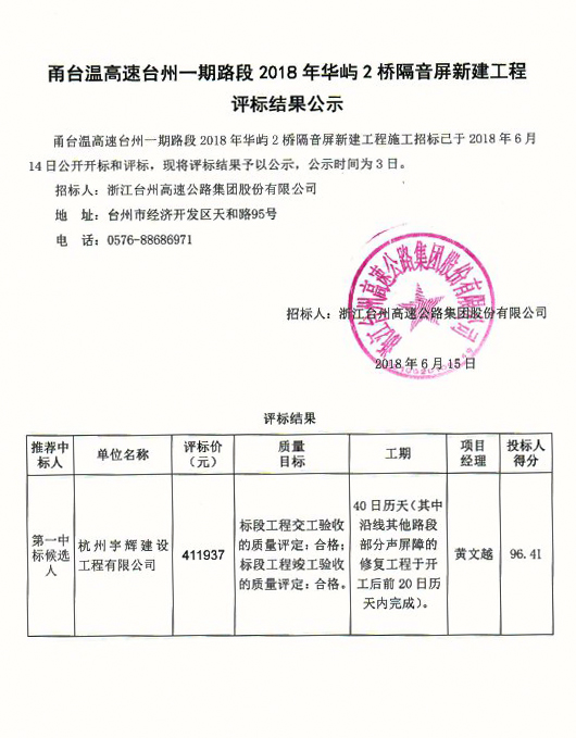 甬臺溫高速臺州一期路段2018年華峪2橋隔音屏新建工程評標(biāo)結(jié)果公示