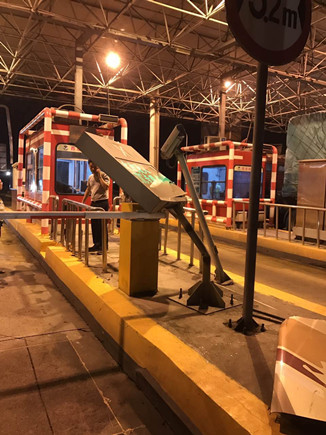 圖為被撞壞的ETC設(shè)備 當晚事故接連不斷。晚上22點40分,臺州收費所ETC進口處,一輛大客車行李車門撞歪顯示屏,同時也撞壞了一只抓拍攝像頭,造成了較大的路產(chǎn)損失,但是當班員工都正在路面上施救,施救中心領(lǐng)導統(tǒng)籌部署,通知兩位在所非當班人員赴崗上班,緊急出動,發(fā)揮連續(xù)作戰(zhàn)精神,進行及時處理。 當以上事故處理完畢,施救人員正準備往回趕的時候,當晚23點10分左右,四輛大貨車在寧向1667K+300M處連環(huán)追尾,其中一輛紅色大貨車車頭嚴重變形并且不斷向外漏油?,F(xiàn)場極不安全,情況危急,施救中心員工馬不停蹄,又一次拉響了救援車的警報,為了爭取時間,甚至通知了另外地點待崗的人員火速趕來,以便能及早處理。此時,施救中心當班人員已經(jīng)全體出動,全部戰(zhàn)斗在路上。 王凱