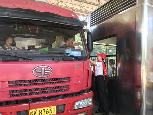 圖為收費(fèi)所員工給過(guò)往司乘人員送清涼品