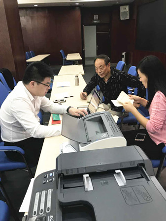 戴著一副黑框眼鏡,憨實魁梧的身形,說話輕言慢語。據(jù)說,某天下班后,還坐在椅子上打電話,一臉溫柔,竊竊私語,同事一直以為他在談戀愛,這打完了電話,才知道是接到股東的電話了,跟對方在解釋股權(quán)收購政策呢。 在股權(quán)流動收購點,小李是電腦操作人員,所以也不大參與解說工作。只是那天正好一位阿婆坐在了電腦對面,說話之間才知大字不識,是聽鄰居說的,就自己摸到這里了。正好手里也空了,李騰飛頓頓身子,放松下來,以黃巖特有的吳言儂語跟阿婆解釋了十幾分鐘,果然,白凈的臉上是一臉的和氣,沉穩(wěn)又實在,確實是傳說中的暖男一枚呀。末了,幫阿婆代簽了字,讓阿婆按了手指印。 但是,在工作的時候,小李讓我們見識到了“騰飛”的效果。流動點只設(shè)一臺筆記本電腦,線上操作都歸他,在大溪鎮(zhèn)政府,來的股東有百十號,流動小組包括駕駛員何杰靚迅速開展了流水作業(yè)。此時此刻,小李那一雙肥白的大手在小巧的鍵盤上十指翻飛,靈活敏捷,操作如行云流水,打印機刷刷地響,不停飛出一份份協(xié)議,傳到下一個工作人員這里。這才知道,每一個人的名字都是名副其實的,“騰飛”的含義是在這里體現(xiàn)的呀。 鄭蔚