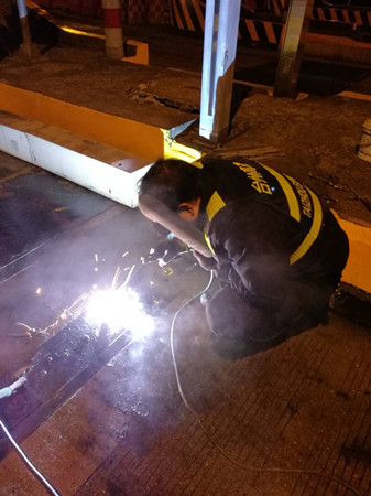到了現(xiàn)場,隊員發(fā)現(xiàn)該車道輪檢器鐵板螺孔由于不斷摩擦并逐漸變大,導致整顆螺栓脫離底下固定螺座,加之當天是春節(jié)高速免費第一天,車輛經(jīng)過時車速都較快,直接將整塊鐵板帶離底座。如果不及時對鐵板進行加工恢復(fù),不僅不能保護下面的輪檢器,而且還有可能造成車輛爆胎??沙σ谷考庸S都已關(guān)門,如果讓廠家發(fā)貨至少也要好幾天。正在兩難之際,中心副經(jīng)理葉俊想到將鐵板與底座邊緣直接焊死的臨時應(yīng)急方法,待節(jié)后再向廠家定制或重新購買。 方案有了,大家兵分兩組,一組去中心倉庫拿電焊機、電焊條等設(shè)備,一組待在原地清理鐵底下方於泥等雜物,為隨后的電焊工作做準備。設(shè)備到位后,葉俊一手操起電焊罩,一手熟練的將電焊條點在了鐵板與底座邊緣之間,經(jīng)過近一個小時的處理,輪檢鐵板與地面底座牢牢地固定在一起,再也不用被飛馳而過的車輛帶離。 項寅曉