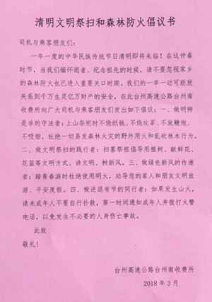 圖為倡議書 為增強(qiáng)防火意識,做到文明祭掃,3月16日上午,臺州南收費所在向過往司乘人員發(fā)放《清明文明祭掃和森林防火倡議書》,倡議大家做明辨是非的守法者:不燒紙錢、不放鞭炮、杜絕野外用火和亂伐林木行為;做文明祭掃的踐行者:提倡用植樹、獻(xiàn)鮮花、花籃等方式祭祖;做綠色新風(fēng)的傳遞者:勸導(dǎo)家人和朋友文明出游;做進(jìn)退有節(jié)的同行者:發(fā)生山火,理智救火。