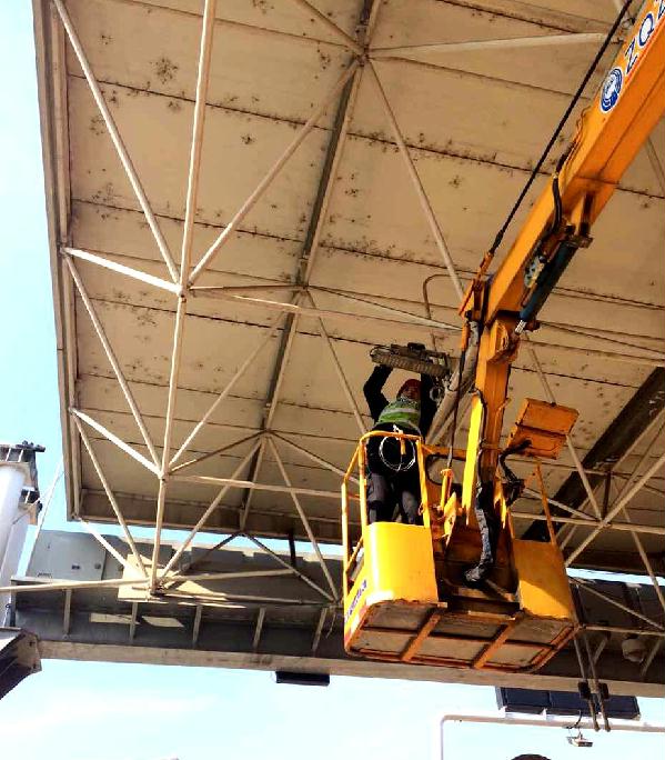 圖為隊(duì)員正在更換車道頂棚燈 期間在臺(tái)州南收費(fèi)所發(fā)現(xiàn)有兩個(gè)車道出現(xiàn)異常,即當(dāng)重型車輛通過時(shí),輪檢鐵板和稱臺(tái)出現(xiàn)不正常晃動(dòng)情況。根據(jù)以往經(jīng)驗(yàn),此情況如不進(jìn)行及時(shí)維修,對(duì)車輛計(jì)重將造成嚴(yán)重影響。對(duì)此,技術(shù)人員不僅對(duì)鐵板上每顆螺栓都進(jìn)行了認(rèn)真細(xì)致的重新加固,之后不厭其煩對(duì)每個(gè)稱臺(tái)限位都進(jìn)行了多次調(diào)整,直至將晃動(dòng)幅度控制在正常范圍內(nèi)。