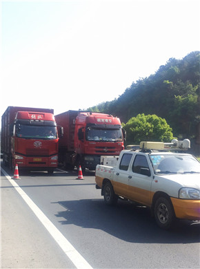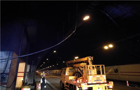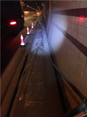 “南廣場有大貨車報警,據(jù)說發(fā)生事故……”4月17日凌晨3時55分,大溪嶺隧道中控室接到了臺州監(jiān)控中心緊急來電,執(zhí)勤隊立即驅(qū)車趕赴現(xiàn)場查勘。 巡邏車到達(dá)南廣場后,執(zhí)勤隊員發(fā)現(xiàn)溫向隧道進(jìn)洞1公里處,隧道頂部的攝像頭被撞損,造成電纜橋架移位,電纜下垂橫跨車道,存在嚴(yán)重安全隱患。事發(fā)突然,執(zhí)勤隊員立刻做好安全預(yù)警措施,同時聯(lián)絡(luò)集團(tuán)工程養(yǎng)護(hù)部機電維養(yǎng)中心,請求支援開展緊急搶修。