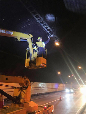 圖為施工人員維修電纜 當(dāng)天早上8時左右,交警開始組織實施封道搶修。作業(yè)期間,大溪嶺隧道所堅守在北洞口卡口預(yù)警,維養(yǎng)中心班員和專業(yè)搶修人員對橋架、掛落的電纜和被撞的攝像頭進(jìn)行了應(yīng)急處理與臨時加固。此時,過往車輛已堵到大溪收費所,這時候,時間就是速度,速度就是通車效率。