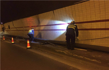 此時此刻,維養(yǎng)中心值班同志已經(jīng)馬不停蹄地奔往現(xiàn)場,中心負(fù)責(zé)人從臨海速度趕往現(xiàn)場。經(jīng)檢查,掛落電纜系汽通門控制線,不影響隧道內(nèi)照明、通訊系統(tǒng)的正常運行。當(dāng)機立斷,決定采取臨時加固的緊急措施,及時聯(lián)系協(xié)調(diào)交警部門,請求封道施工的幫助和支持。