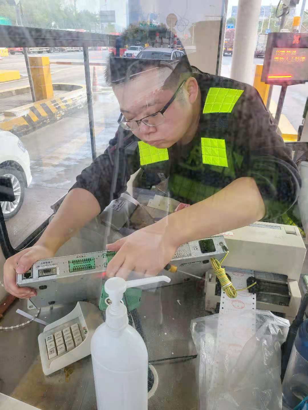 “咦,崗?fù)ぷ郎系倪@個扁長形設(shè)備哪里去了,忽然感覺桌面整潔了好多!”剛來交班的臺州收費(fèi)所收費(fèi)員李靜一臉疑惑,“拿掉了這個設(shè)備,ETC車輛還能正常通行嗎?” “不是拿掉了,是我們給它般了個‘新家’而已?!惫こ滩繖C(jī)電設(shè)備維養(yǎng)中心陳華棟指了指安裝在桌面下方的設(shè)備。