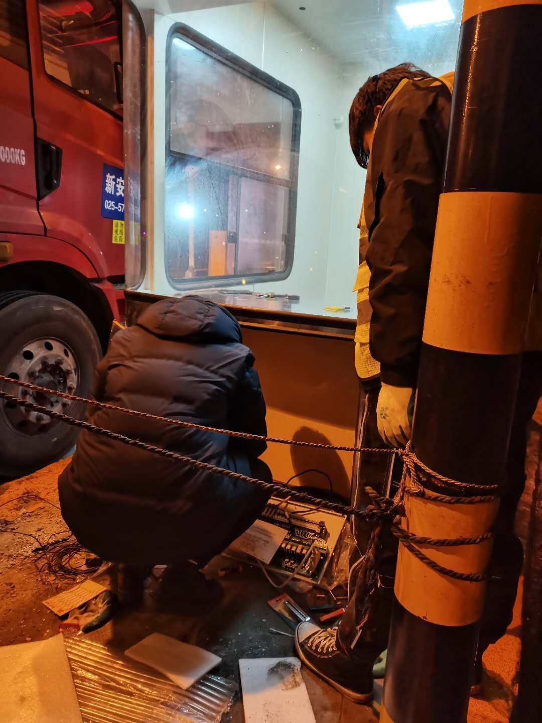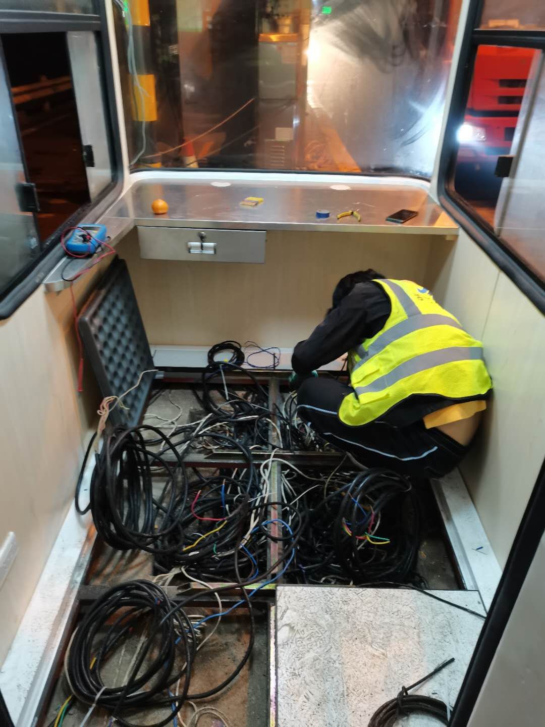 21日下午4點(diǎn)左右,訂購的新崗?fù)ず蛽p壞的設(shè)備設(shè)施陸續(xù)到位,中心值班人員協(xié)同設(shè)備廠家一起將其安放并固定至車道原位置。因崗?fù)A倒時(shí)拉斷了底下很多線纜,在拆除設(shè)備時(shí)又因?yàn)榫o急搶修需要沒有作相應(yīng)標(biāo)注,現(xiàn)場(chǎng)各種電線接頭雜亂如麻。考慮到夜間查線、接線存在一定的安全隱患,也不利于施工,搶修人員決定第二天再戰(zhàn)。