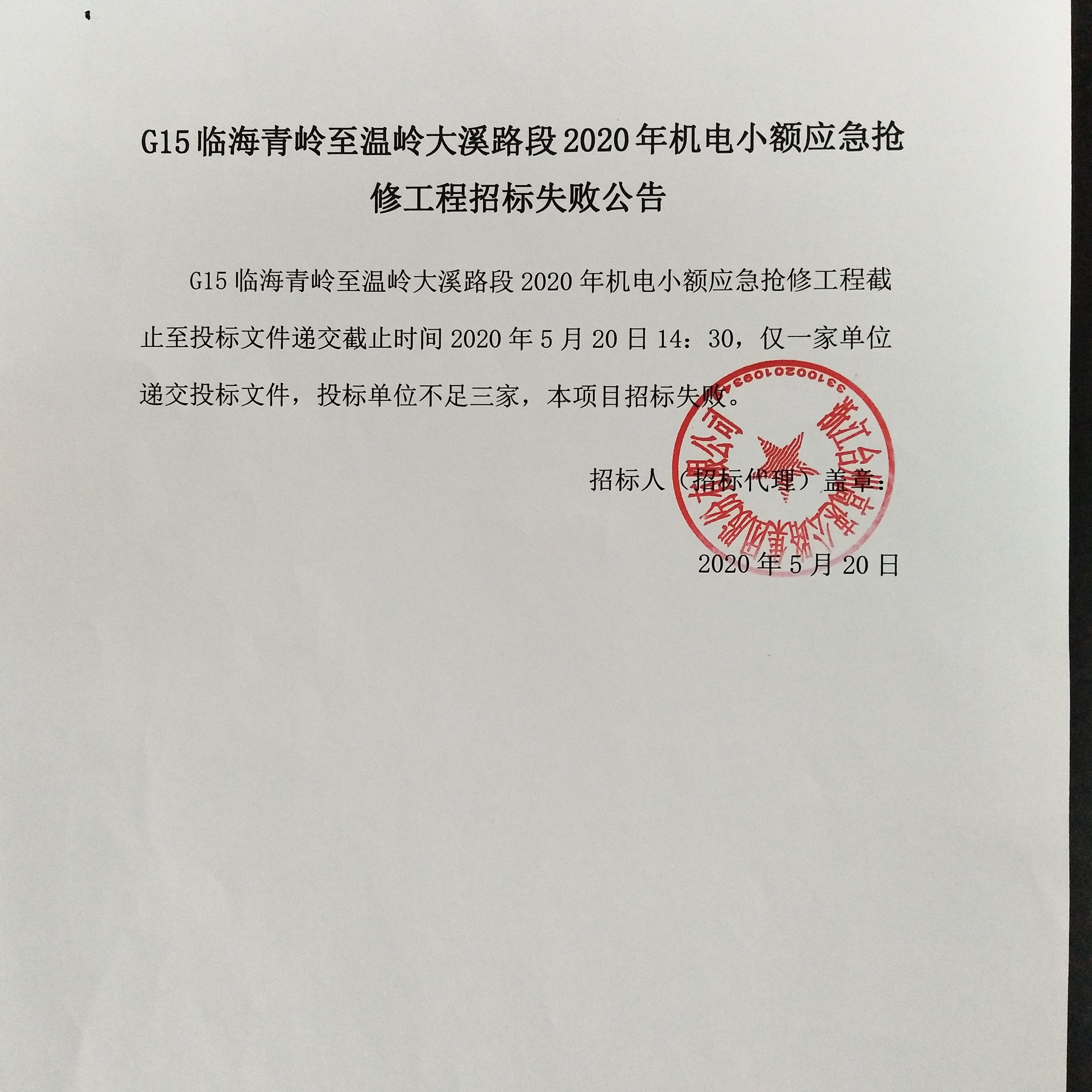 G15臨海青嶺至溫嶺大溪路段2020年機電小額應(yīng)急搶修工程招標(biāo)失敗公告