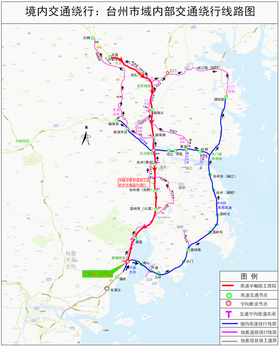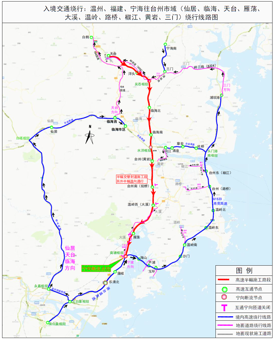 在甬臺(tái)溫高速寧波方向南塘樞紐進(jìn)行斷流,所有車(chē)輛改走甬莞高速;甬莞高速南塘樞紐轉(zhuǎn)甬臺(tái)溫高速寧波方向匝道關(guān)閉;臺(tái)金高速水洋樞紐轉(zhuǎn)甬臺(tái)溫高速寧波方向匝道關(guān)閉;甬臺(tái)溫高速溫州方向吳岙樞紐轉(zhuǎn)上三高速上虞方向匝道關(guān)閉;甬臺(tái)溫高速溫州方向、上三高速三門(mén)方向保持通行,部分路段借用對(duì)向車(chē)道通行。