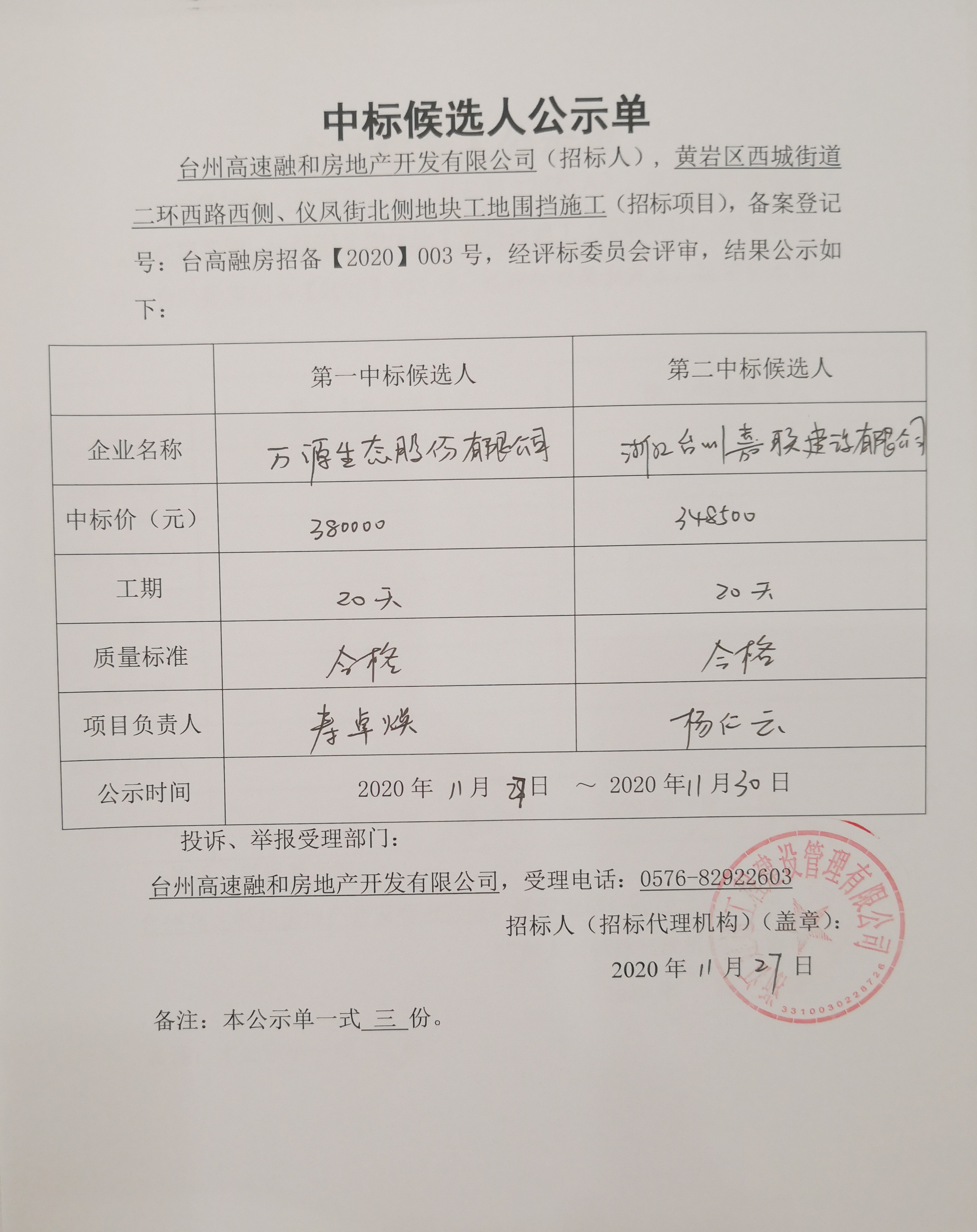 黃巖區(qū)西城街道二環(huán)西路西側(cè)、儀鳳街北側(cè)地塊工地圍擋施工(招標(biāo)項目)中標(biāo)候選人公示單