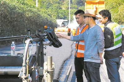 “路面銑刨時有時會出現(xiàn)銑刨不完全存在夾層的現(xiàn)象,如不清理干凈則會嚴(yán)重影響攤鋪后路面的平整度?!睏罱鹆航榻B道,所以攤鋪時每道工序,他都時刻緊盯,確保攤鋪的路面不存在任何瑕疵。
