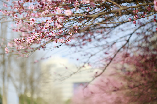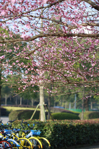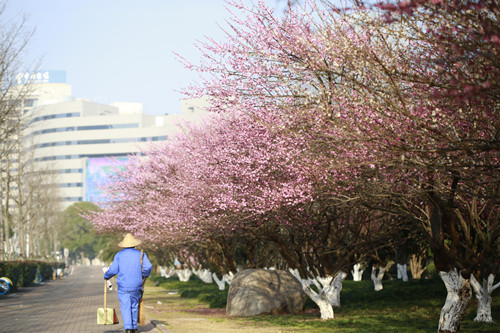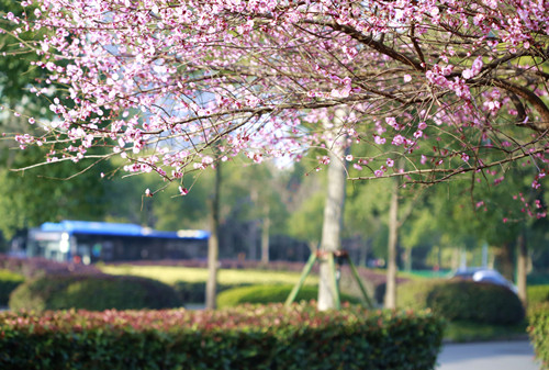 最后一站,便是市民廣場,我見過的最美公交站臺。初春的清晨啊,一下車便有沁香拂散,迎接我下車的那是大片繁花盛開呀,路邊草地一溜的紅梅、白梅,在藍(lán)天下絢爛地肆無忌憚地綻放。呵,是的,還有藍(lán)天,最近流行的一個詞叫“臺州藍(lán)”,忽然想起來,每日公交車上下班,低碳出行,這算是我為“臺州藍(lán)”添了一筆淡藍(lán)嗎?應(yīng)該是吧。于是,在藍(lán)天紅白花海中,慢慢穿過梅林、小橋、亭子,上班之路竟是如此心情舒緩。 鄭蔚