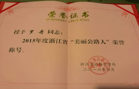 圖為羅丹獲得“美麗公路人”的榮譽(yù)證書(shū)