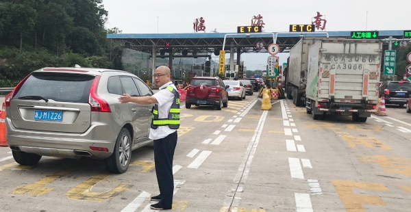 節(jié)日期間,車流量比往日多很多,每天多次出現(xiàn)長時間大分流,一遇上高峰期車輛源源不斷地從各個方向匯聚在此,容易造成內(nèi)外廣場堵車。臨海南收費(fèi)所車輛雖多,但該站所出口秩序井然,未出現(xiàn)擁堵現(xiàn)象。瞧!這位在車流中,身著反光背心在這場大車流中,揮舞著雙臂指揮著交通,讓飛馳的車輛通過客貨分離,有效降低客貨車隨意串道,達(dá)到快速放行的是四班班長楊俊輝。