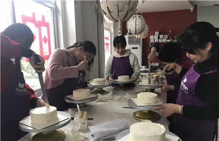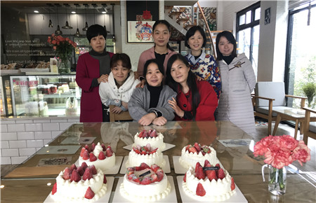 圖為活動(dòng)現(xiàn)場(chǎng) “大膽地將奶油抹開(kāi),刀頭45度推開(kāi)奶油,將蛋糕胚鋪滿(mǎn)……”烘焙老師耐心熟練地邊做示范,邊告訴大家制作要領(lǐng),“注意手握刀的姿勢(shì),涂側(cè)面刀要豎直!” 女職工們穿著圍裙,認(rèn)真模仿老師的手法,小心地學(xué)著抹平、收邊,跟著老師的步驟進(jìn)行裱花、放水果、撒糖粉,在大家的共同努力下,一個(gè)個(gè)蛋糕從原料變作成品。